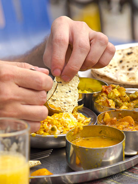 Eating traditional indian food Thali with hands and spoon.